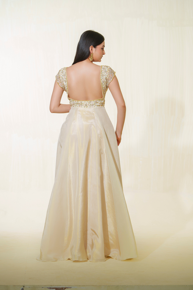Elevate your ensemble with our Light Gold Silk Tissue Anarkali, featuring an ombre ivory and gold hue. Handcrafted cutwork detailing adds timeless elegance.