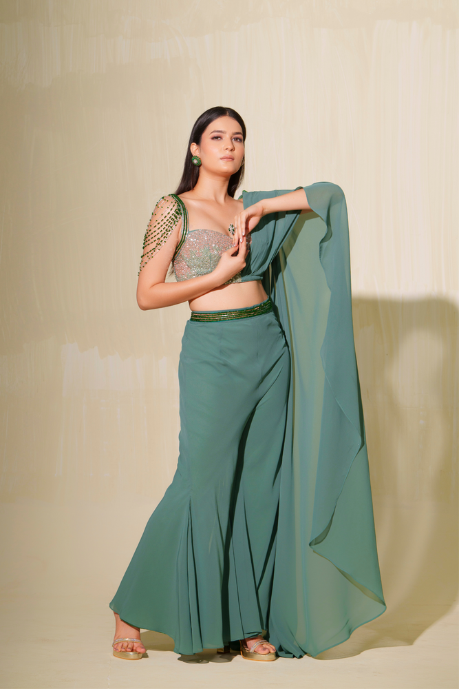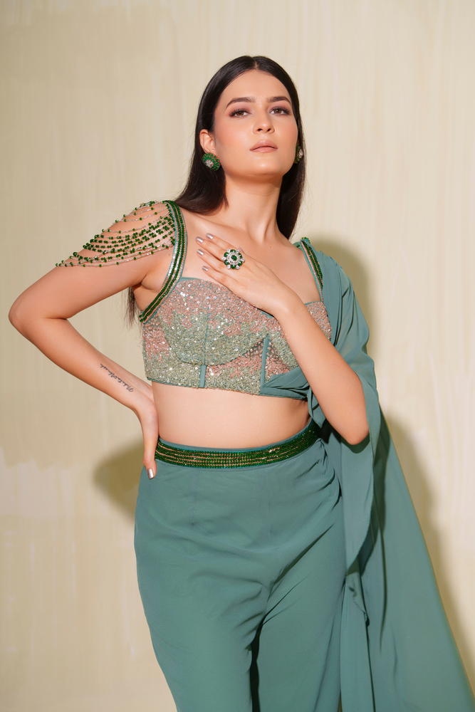 Duck green handcrafted sequin and crystal shimmer corset with shoulder drape Paired with georgette bootcut flared pants.