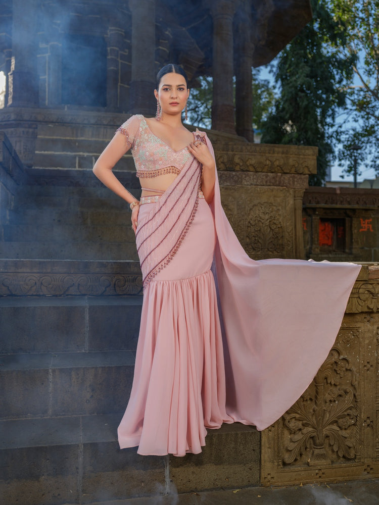 A mauve draped georgette saree with a mermaid silhouette, enhanced with sheer tulle and intricate glass bead hand embroidery for an elegant, sculpted look.
