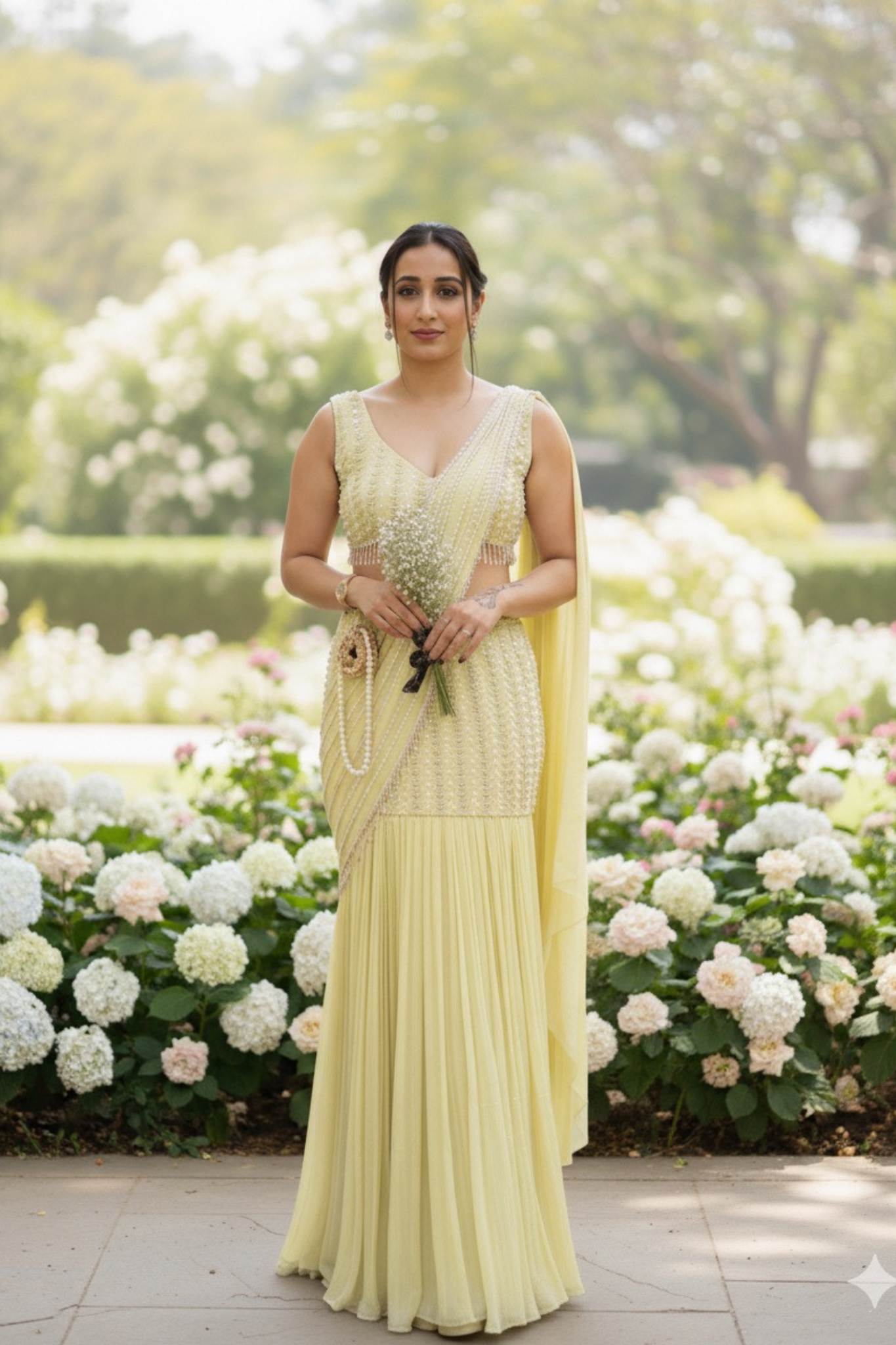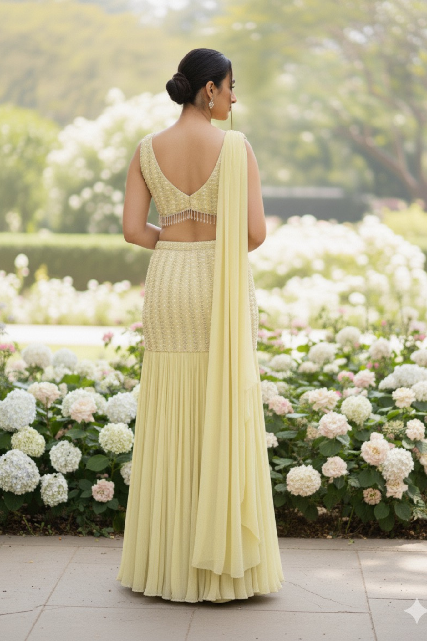 A pale green mermaid drape saree with a sheer embroidered blouse, adorned with pastel glass beads and floral motifs for a sculpted yet ethereal look.