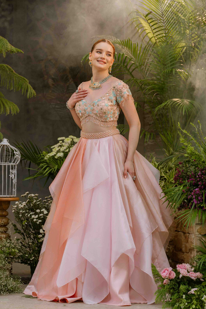 Multicolour shimmer organza lehenga with handkerchief drape, paired with a blush and seagreen cutwork blouse in sequins, pearls, mirrors, and crystal tassels.