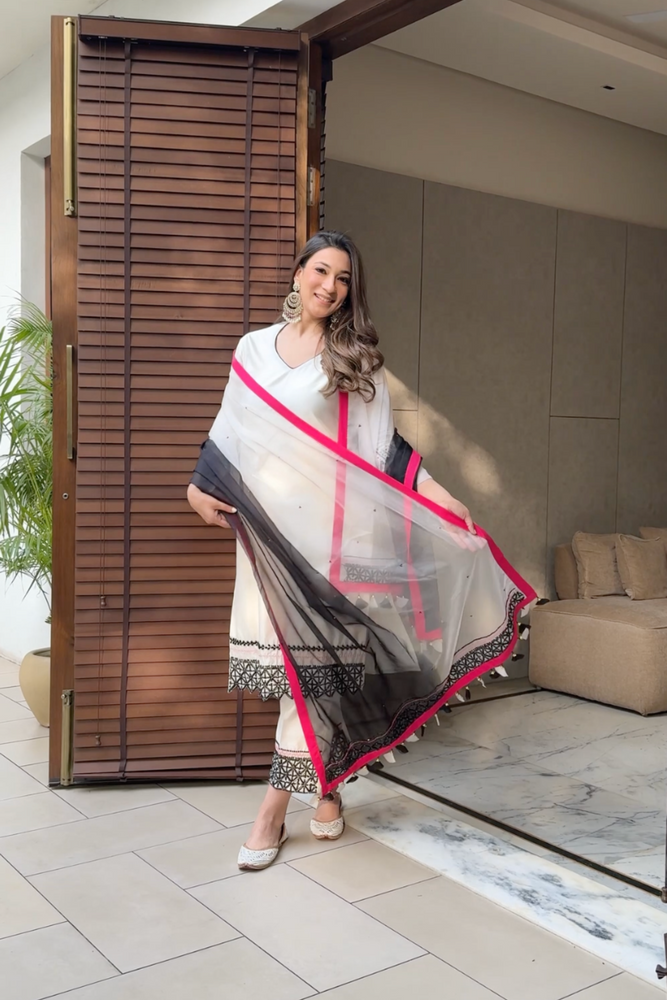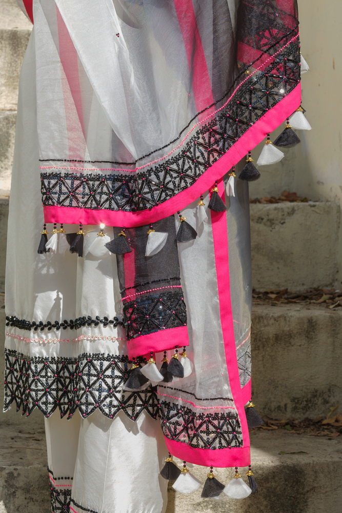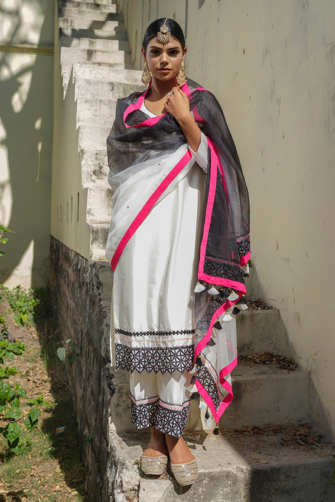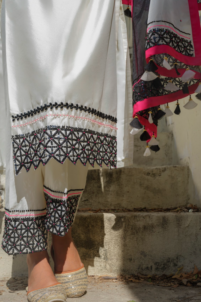 Ivory Tafetta silk straight handcrafted kurta suit paired with straight pants and silk organza black and ivory ombre duppatta finished with handmade tassels on the duppatta . The handembroidery is done using glass beads, sequins and ivory pearls