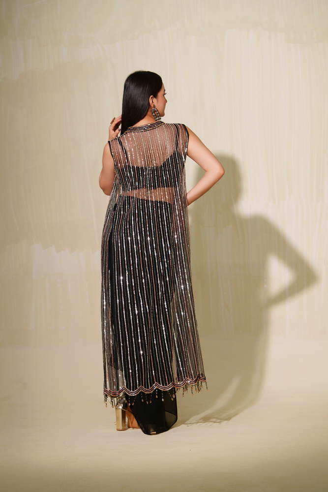 Black ruched bustier, paired with a pleated drape dhoti skirt that's as comfortable as it is stylish. Topped off with a handcrafted tulle scallop crystal long jacket adorned with playful tassels.